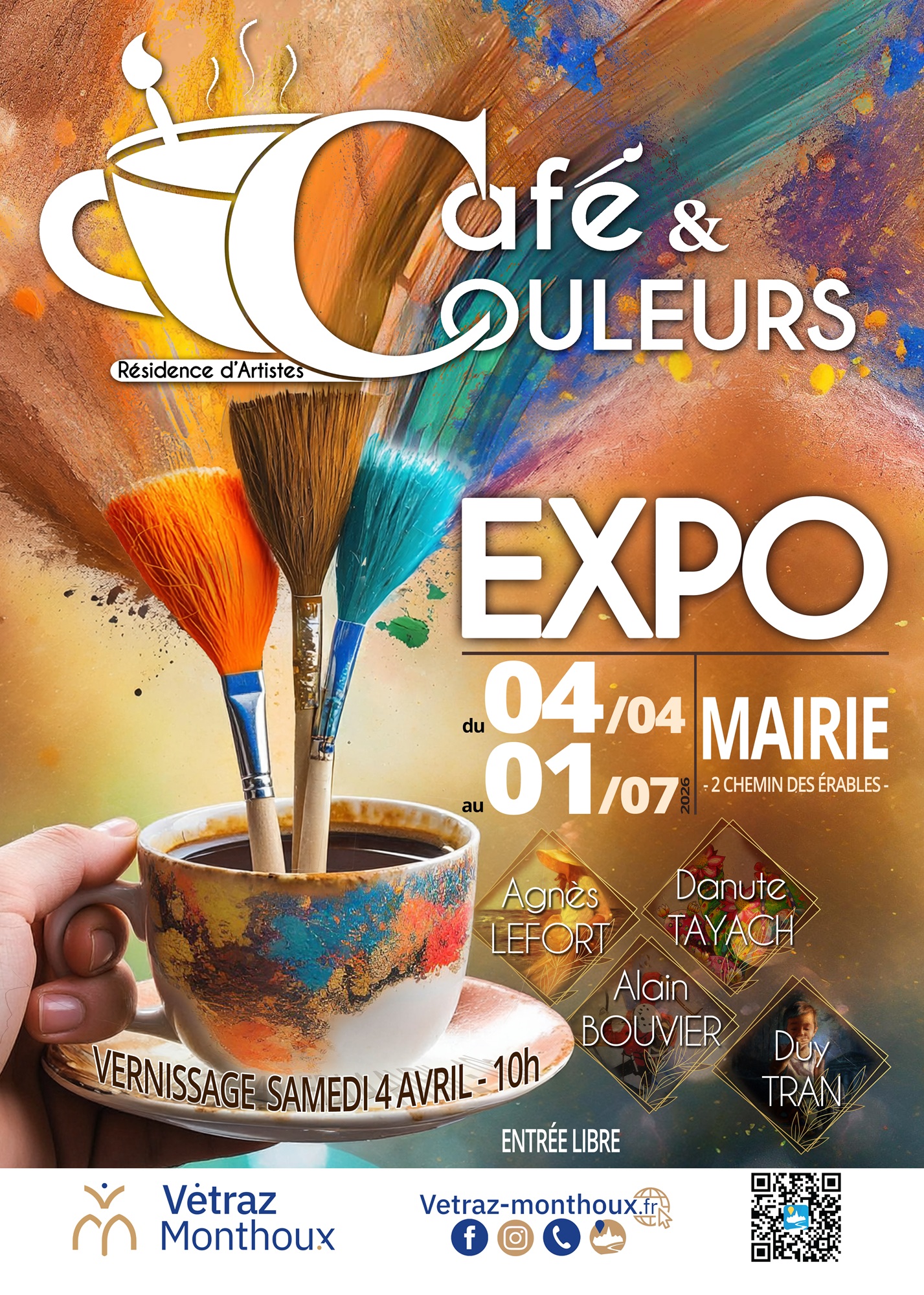 Pour notre 1er Café et Couleurs, nous vous accueillons du 4 avril au 1er juillet 2026, au rez-de-chaussée de la mairie (salle du Conseil Municipal et grand couloir), du lundi au vendredi, aux horaires d’ouverture de la mairie (de 8h30 à 12h et de 13h30 à 17h, à l’exception du mardi après-midi).